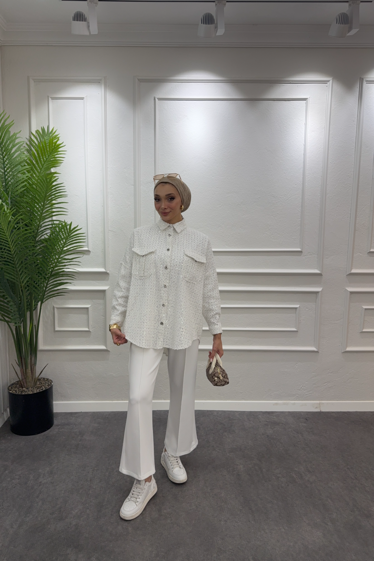 Pul İşlemeli Oversize Ceket - Beyaz